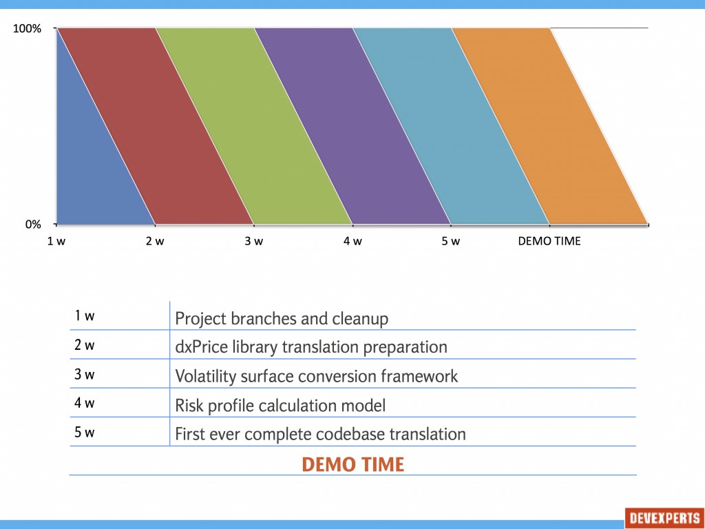 Interesting fact: all those steps took up almost 4 weeks of continuous work, and we couldn’t demonstrate any intermediate result. All this stuff – codebase preparation, start of prototype development, code translation, serialization mechanism and model development – can be considered as literally an atomic operation. Either they complete everything and calculate risk profile, or could basically show nothing. It is impossible to calculate the left part of the graph while the right one is not done yet. At some point even the ideologist of the whole approach – started to doubt whether it was a good idea at all. Wasn’t it better to just calculate everything on the back-end sacrificing the user experience for demo purposes?