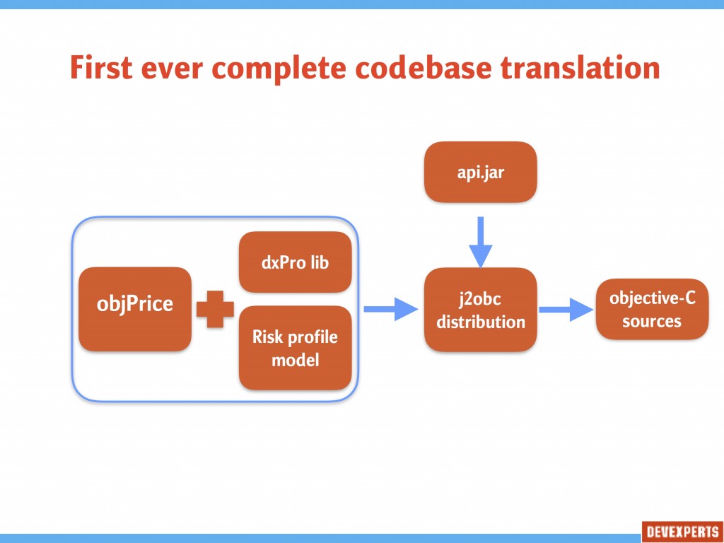 Devexperts Mobile team had everything we needed – the library with calculation model, the template application and the Java to Objective-C translator. The next hurdle to overcome, was that the dxPrice library had been designed without taking into consideration dxByte’s restrictions. After considerable investigation the decision was made to use the outside translator Google’s j2objc instead.
