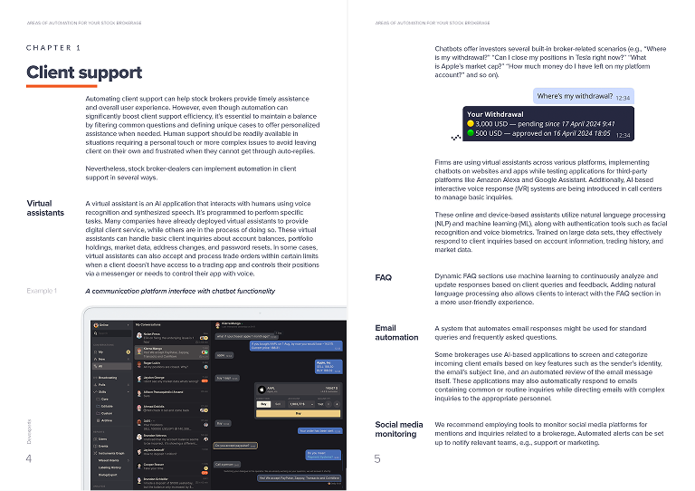 It’s also for product and operations managers seeking practical blueprints: virtual assistants and dynamic FAQs for support; AMS and chatbots for engagement; exposure controls and smart routing for risk and execution; IDP for document flows; and AI-assisted surveillance.