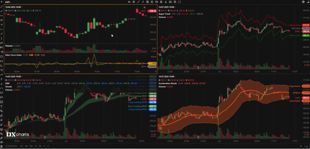 DXcharts Updates: Seven New Indicators and Enhanced React Support September 4, 2025 Bit update incoming! We’ve added seven new technical indicators to your toolkit, plus React 19 support and some handy improvements that enhance your charting workflow. Let’s break it down. Your new indicator arsenal Say hello to Acceleration Bands, Donchian Channels, Elder Force Index, EMA Clouds, Historical Volatility, Stochastic RSI, and Super Trend. That’s a mouthful, but each one brings something different to the table. Elder Force Index uses price and volume to show buying or selling pressure. Super Trend follows market volatility to indicate trend direction. EMA Clouds create visual support and resistance zones between moving averages. Plus Acceleration Bands, Donchian Channels, Historical Volatility, and Stochastic RSI — each bringing their own approach to market analysis. These aren’t random picks either. We’ve been getting requests for these specific indicators, so consider this our way of saying “we hear you”. Want more details? Check out our knowledge base for in-depth info on each indicator. React 19 is here For all developers out there juggling React versions — we’ve got you covered. DXcharts now plays nice with React 19, so you can use all those shiny new features without worrying about compatibility headaches. Legend gets smarter Remember how we improved the right-click menu for indicators? Well, we’re not done yet. The indicator legend now has a visibility toggle and its own right-click menu. These additions make managing multiple indicators much more straightforward. Menu magic We added an API that shows or hides chart menus based on focus. Sounds technical, but it’s especially useful when you’re working with multiple charts and want to keep the interface clean. Give it a try! These features are live now, so dive in and see what works best for your setup. We’re already working on what’s next, so keep an eye out for future updates! The DXcharts team